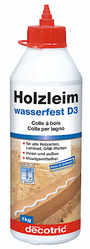 Colle à bois résistante à l’humidité pour le collage de tous les bois. Particulièrement adaptée pour le collage du stratifi é, du parquet flottant et des panneaux de particules.